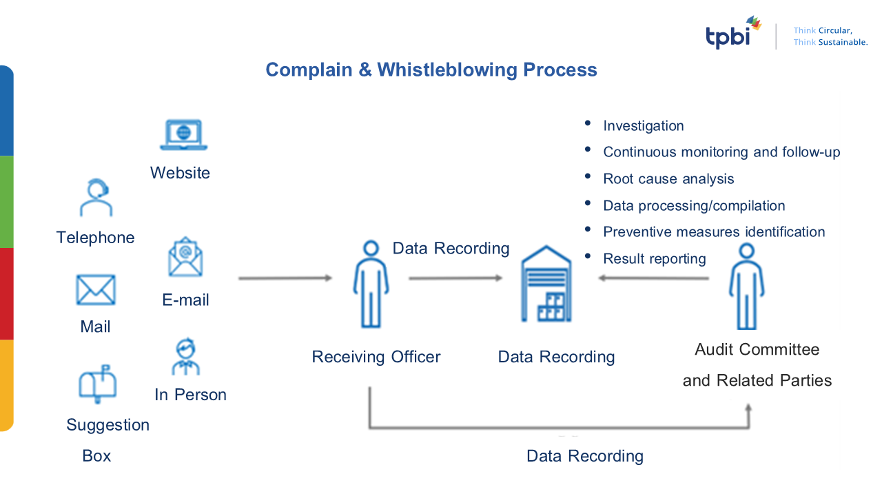 The Company continuously promotes transparent and auditable work practices and corporate governance. Complainants can inquire about details, file complaints, or report misconduct regarding legal violations, inaccuracies in financial reports, deficient internal control systems, or violations of the Company's business ethics through 6 channels: website, telephone, email, mail, and in person. The Investor Relations unit and Company Secretary are responsible for receiving opinions and various complaints from shareholders and investors, while management representatives and Human Resources are responsible for receiving opinions and grievances from employees. The Company has established clear procedures for handling complaints from shareholders, customers, employees, and other stakeholders to protect rights and preserve the privacy of complainants. Such complainants will receive protection and their personal information will be kept confidential, accessible only to relevant parties. In cases where there are complaints of potential misconduct, an investigation committee will be established, consisting of senior management and representatives from departments with no vested interest in the matter, to investigate and proceed according to the Company's disciplinary regulations and report to the Audit Committee and Board of Directors.