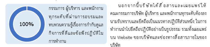นอกจากนี้บริษัทได้สื่อสารและเผยแพร่ให้คณะกรรมการบริษัท ผู้บริหาร และพนักงานทุกระดับต้องลงนามรับทราบและยึดถือเป็นแนวทางปฏิบัติส่วนหนึ่ง ในการทำงานนำไปยึดถือปฏิบัติอย่างเป็นรูปธรรม รวมทั้งเผยแพร่บน Website ของบริษัทและช่องทางสื่อสารภายในของบริษัท