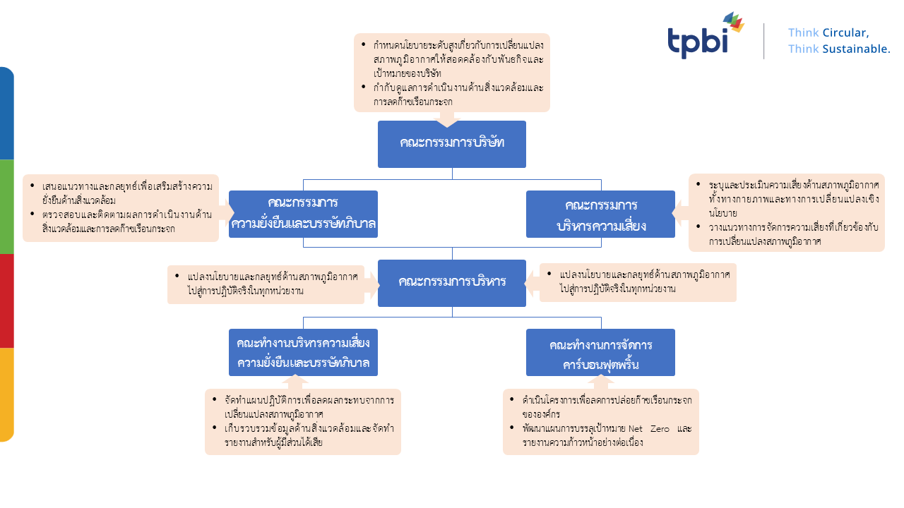 - ประเมินความเสี่ยงและโอกาสจากการเปลี่ยนแปลงสภาพภูมิอากาศ โดยผนวกรวมกับการประเมินความเสี่ยงองค์กรเพื่อเตรียมพร้อมและป้องกันผลกระทบจากการเปลี่ยนแปลงของสภาพภูมิกาศต่อธุรกิจ